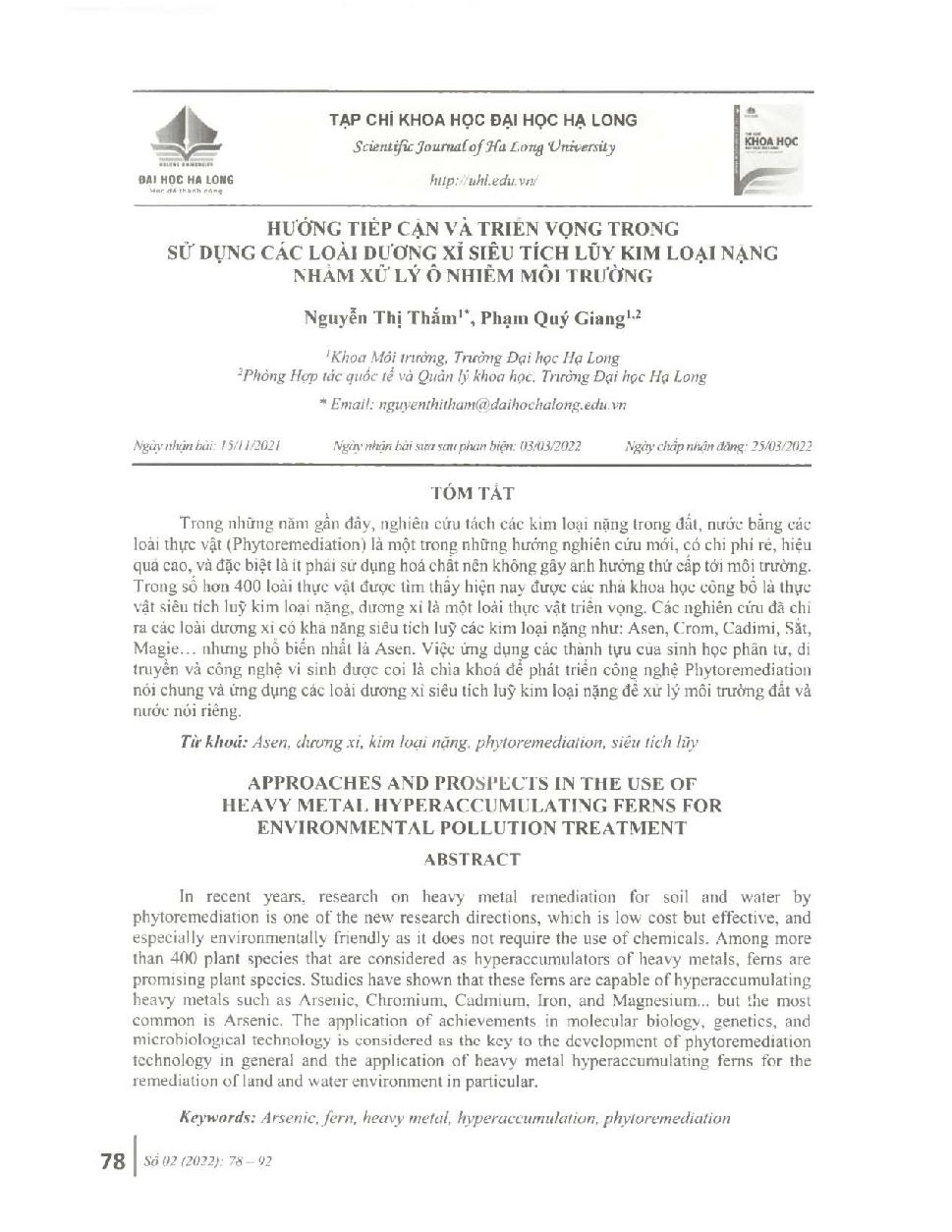 Hướng tiếp cận và triển vọng trong sử dụng các loài dương xỉ siêu tích lũy kim loại nặng nhằm xử lý ô nhiễm môi trường = Approaches and prospects in the use of heavy metal hyperaccumulating ferns for environmental pollution treatment