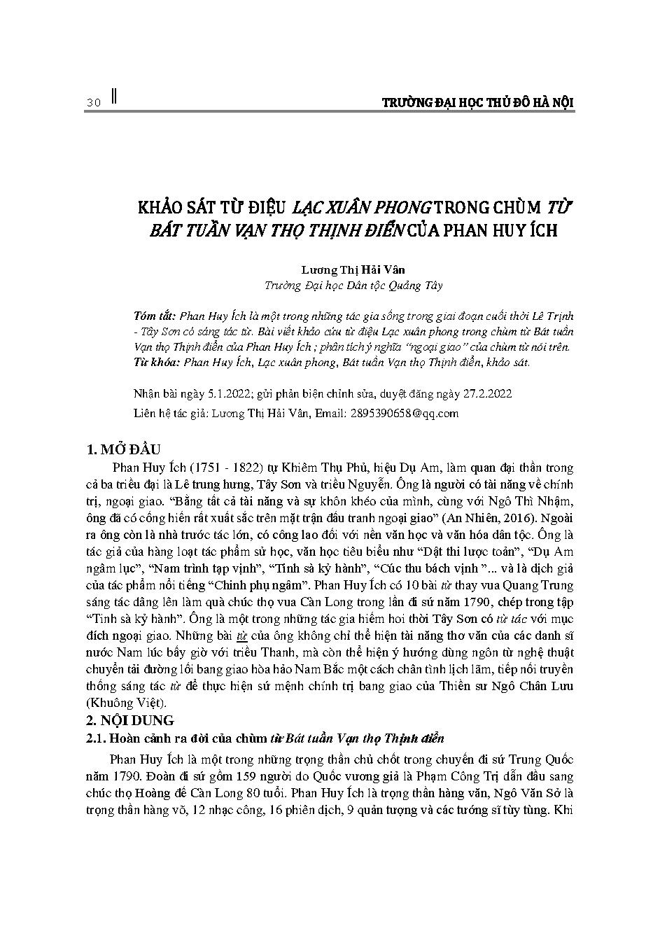 Khảo sát từ điệu Lạc xuân phong trong chùm từ bát tuần vạn thọ thịnh điển của Phan Huy Ích = A study of phan Huy Ich&; 39;s lac chunfeng Ci poems in the eight weeks of longevity and prosperity