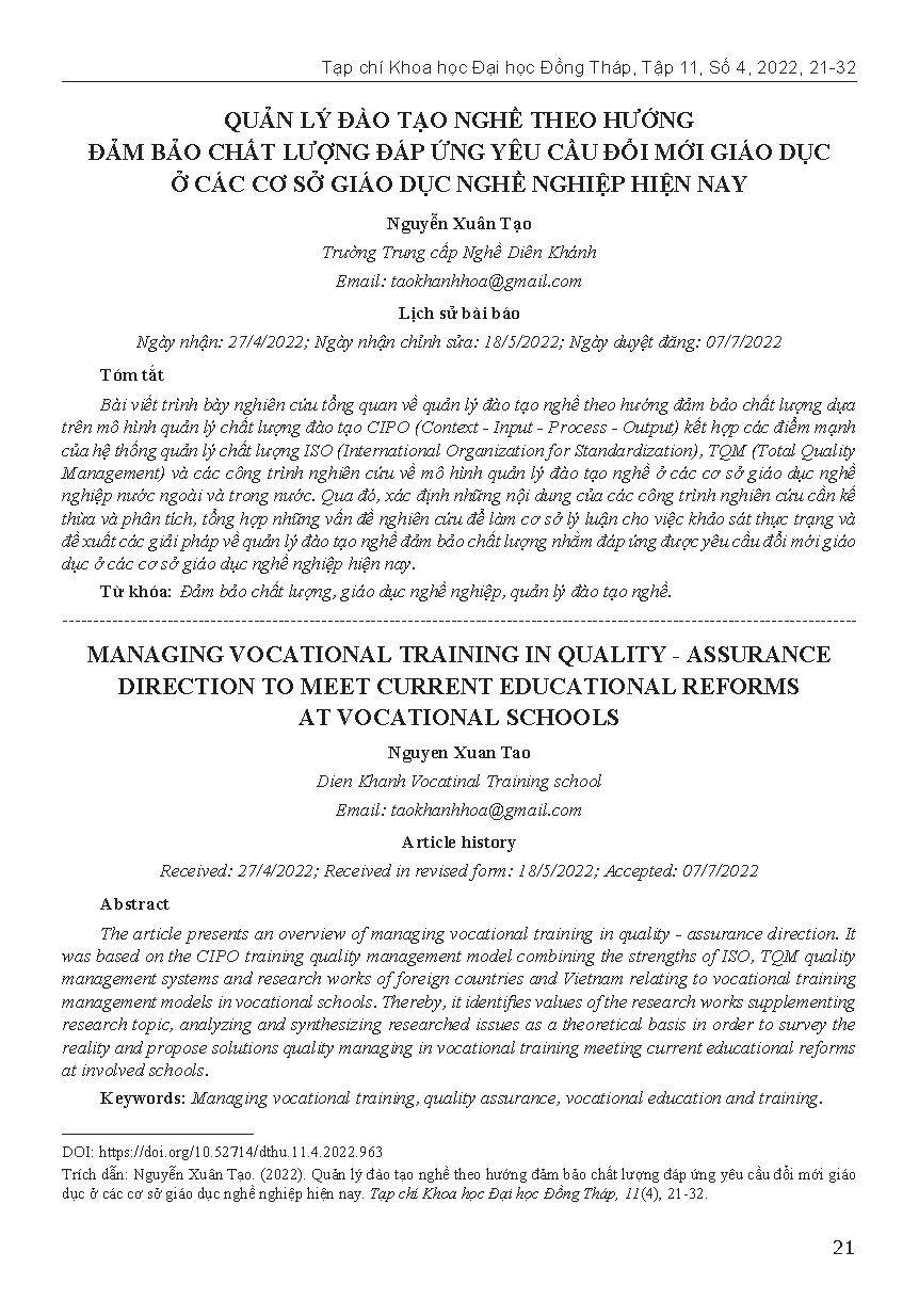 Quản lý đào tạo nghề theo hướng đảm bảo chất lượng đáp ứng yêu cầu đổi mới giáo dục ở các cơ sở giáo dục nghề nghiệp hiện nay = Managing vocational training in quality-assurance direction to meet current educational reforms at vocational schools