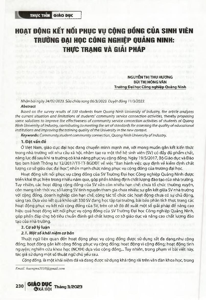 Hoạt động kết nối phục vụ cộng đóng của sinh viên Trường Đại học Công nghiệp Quảng Ninh: Thực trạng và giải pháp = Connecting activities to serve student community of Quang Ninh University of Industry - Current situation and solutions