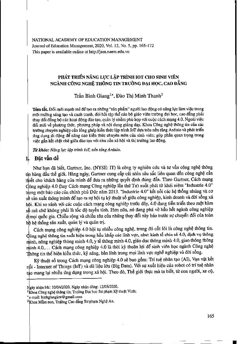Phát triển năng lực lập trình IoT cho sinh viên ngành công nghệ thông tin trường đại học, cao đẳng = Developing iot programing competence for students of it major at universities and colleges