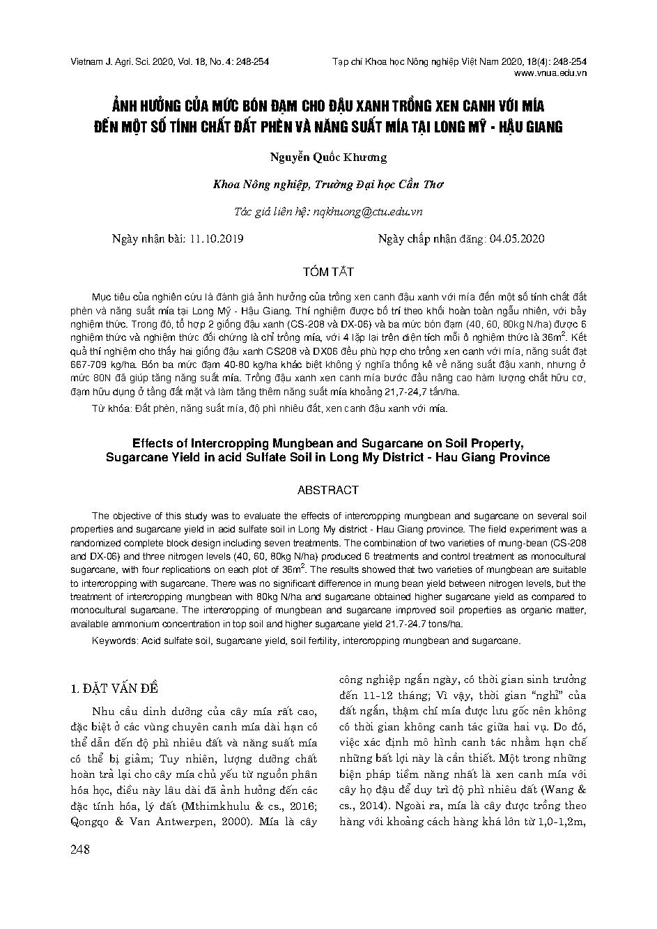 Ảnh hưởng của mức bón đạm cho đậu xanh trồng xen canh với mía đến một số tính chất đất phèn và năng suất mía tại Long Mỹ - Hậu Giang = Effects of Intercropping Mungbean and Sugarcane on Soil Property, Sugarcane Yield in acid Sulfate Soil in Long My District - Hau Giang Province