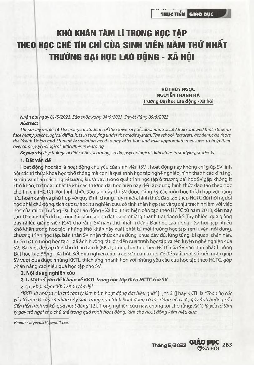Khó khăn tâm lí trong học tập theo học chế tín chỉ cùa sinh viên năm thứ nhất Trường Đại học Lao động - Xã hội = Psychological difficulties in credit learning of first-year students at University of Labor and Social Affairs.
