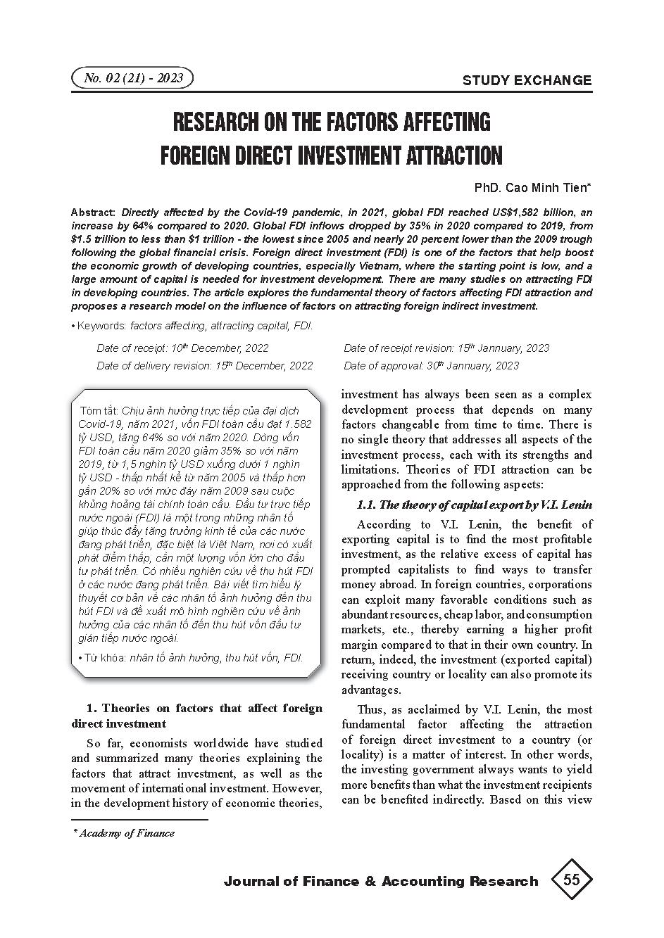 Nghiên cứu các nhân tố ảnh hưởng thu hút vốn đầu tư trực tiếp nước ngoài = Research on the factors affecting foreign direct investment attraction