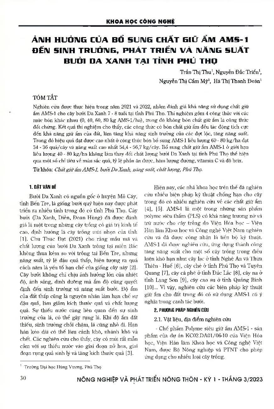 Ảnh hưởng của bổ sung chất giữ ẩm AMS - 1 đến sinh trưởng, phát triển và năng suất bưởi da xanh tại tỉnh Phú Thọ = Effects of absorbent polyme AMS-1 on growth, development and yield of da xanh pummelo in Phu Tho province