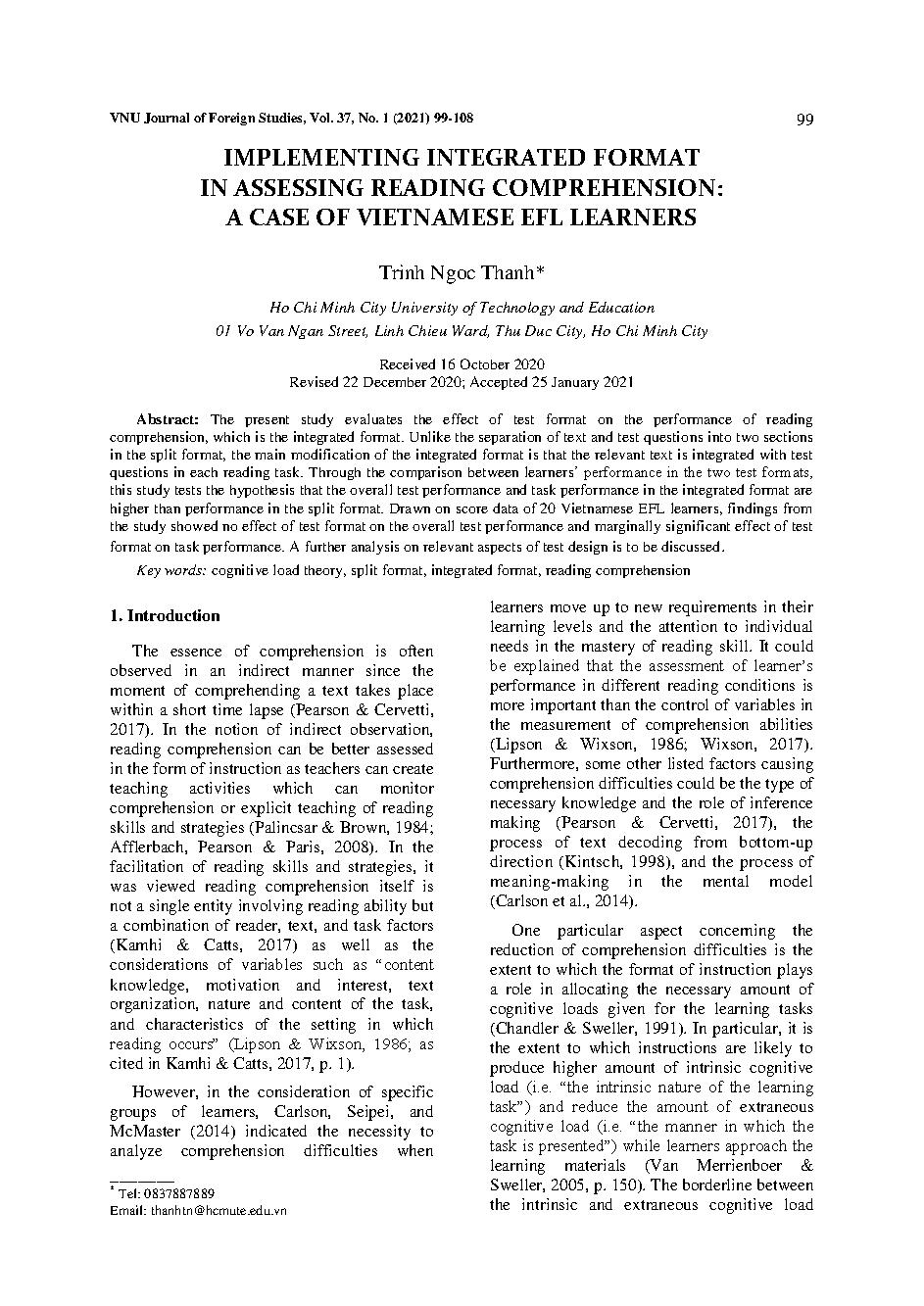 Ứng dụng dạng bài tích hợp vào đánh giá đọc hiểu tiếng Anh: Trường hợp người học tại Việt Nam