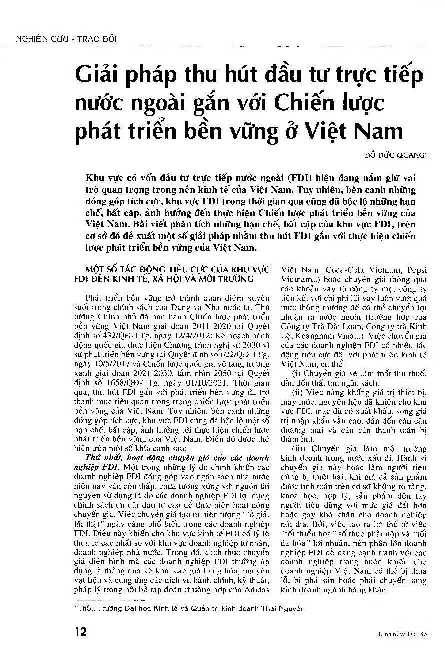 Giải pháp thu hút đầu tư trực tiếp nước ngoài gắn với Chiến lược phát triển bền vững ở Việt Nam