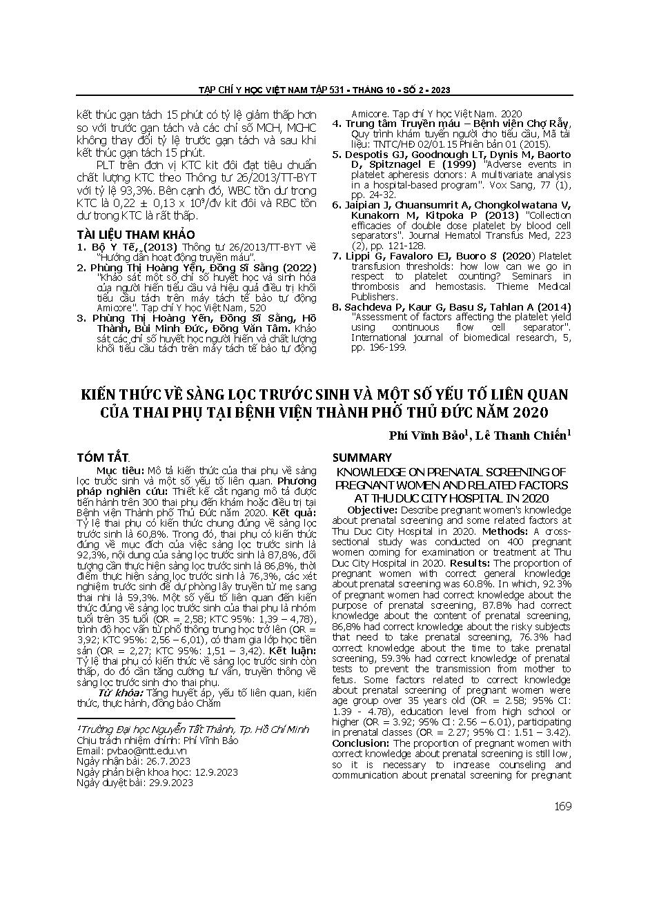 Kiến thức về sàng lọc trước sinh và một số yếu tố liên quan của thai phụ tại Bệnh viện thành phố Thủ Đức năm 2020 = Knowledge on prenatal screening of pregnant women and related factors at Thu Duc city hospital in 2020