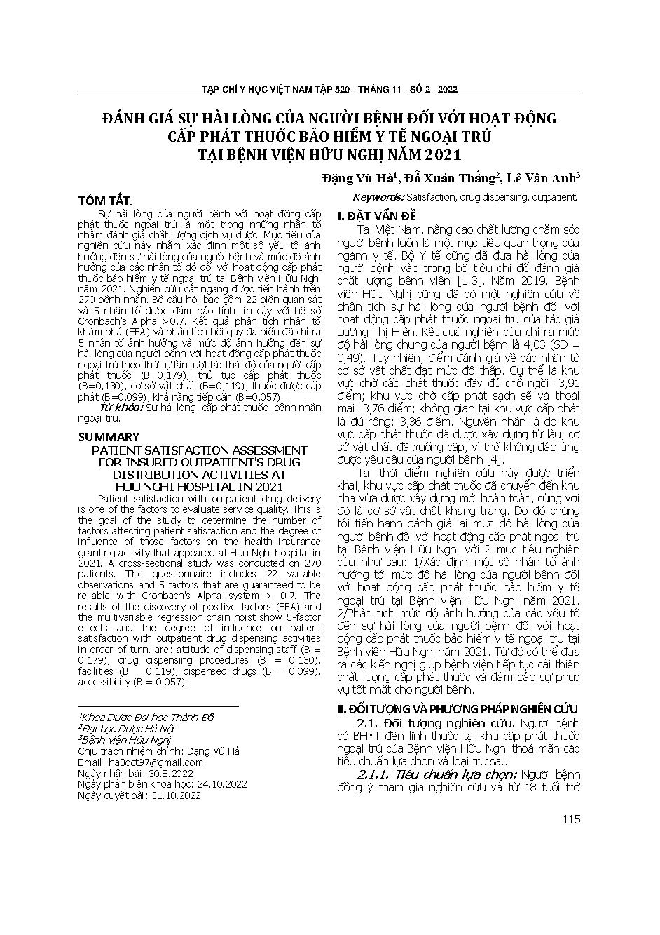 Đánh giá sự hài lòng của người bệnh đối với hoạt động cấp phát thuốc bảo hiểm y tế ngoại trú tại Bệnh viện Hữu nghị năm 2021 = Patient satisfaction assessment for insured outpatient's drug distribution activities at Huu Nghi hospital in 2021