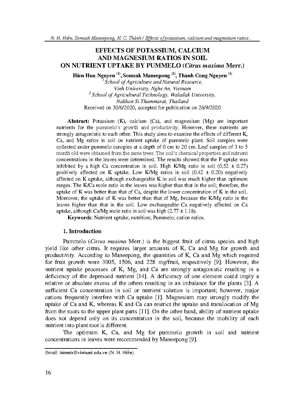 Ảnh hưởng của tỷ lệ kali, canxi và magiê trong đất trồng đến khả năng hấp thu dinh dưỡng của cây bưởi = Effects of potassium, calcium and magnesium ratios in soil on nutrient uptake by pummelo (Citrus maxima Merr.)