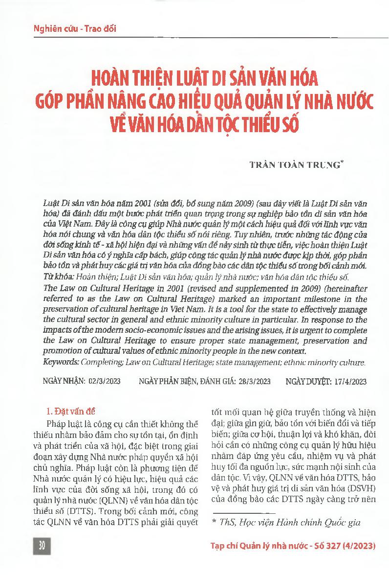 Hoàn thiện Luật Di sản văn hóa góp phần nâng cao hiệu quả quản lý nhà nước về văn hóa dân tộc thiểu số = Completion of the Law on Cultural Heritage contributes to improving the effectiveness of state management of ethnic minority culture