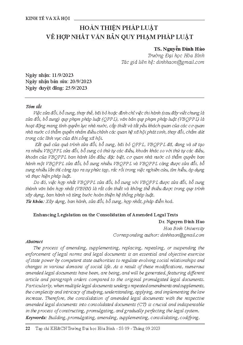 Hoàn thiện pháp luật về hợp nhất văn bản quy phạm pháp luật = Enhancing legislation on the consolidation of amended legal texts