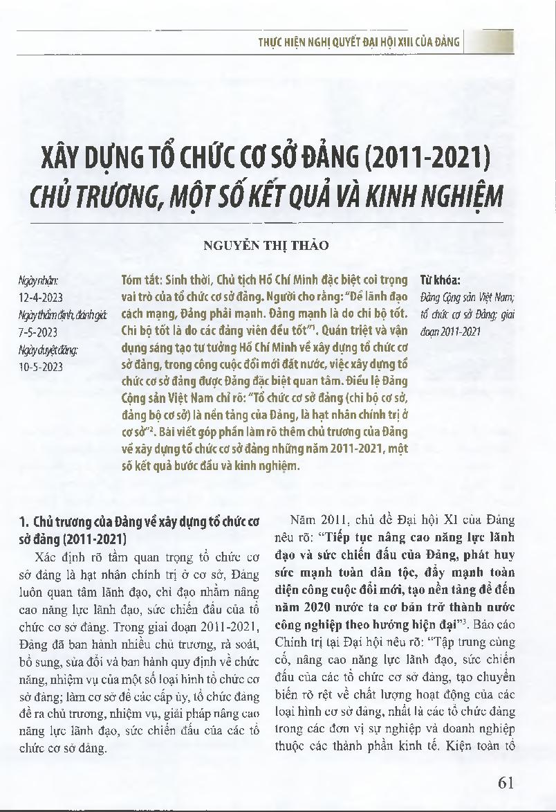 Xây dựng tổ chức cơ sở Đảng (2011 -2021) chủ trương, một số kết quả và kinh nghiệm