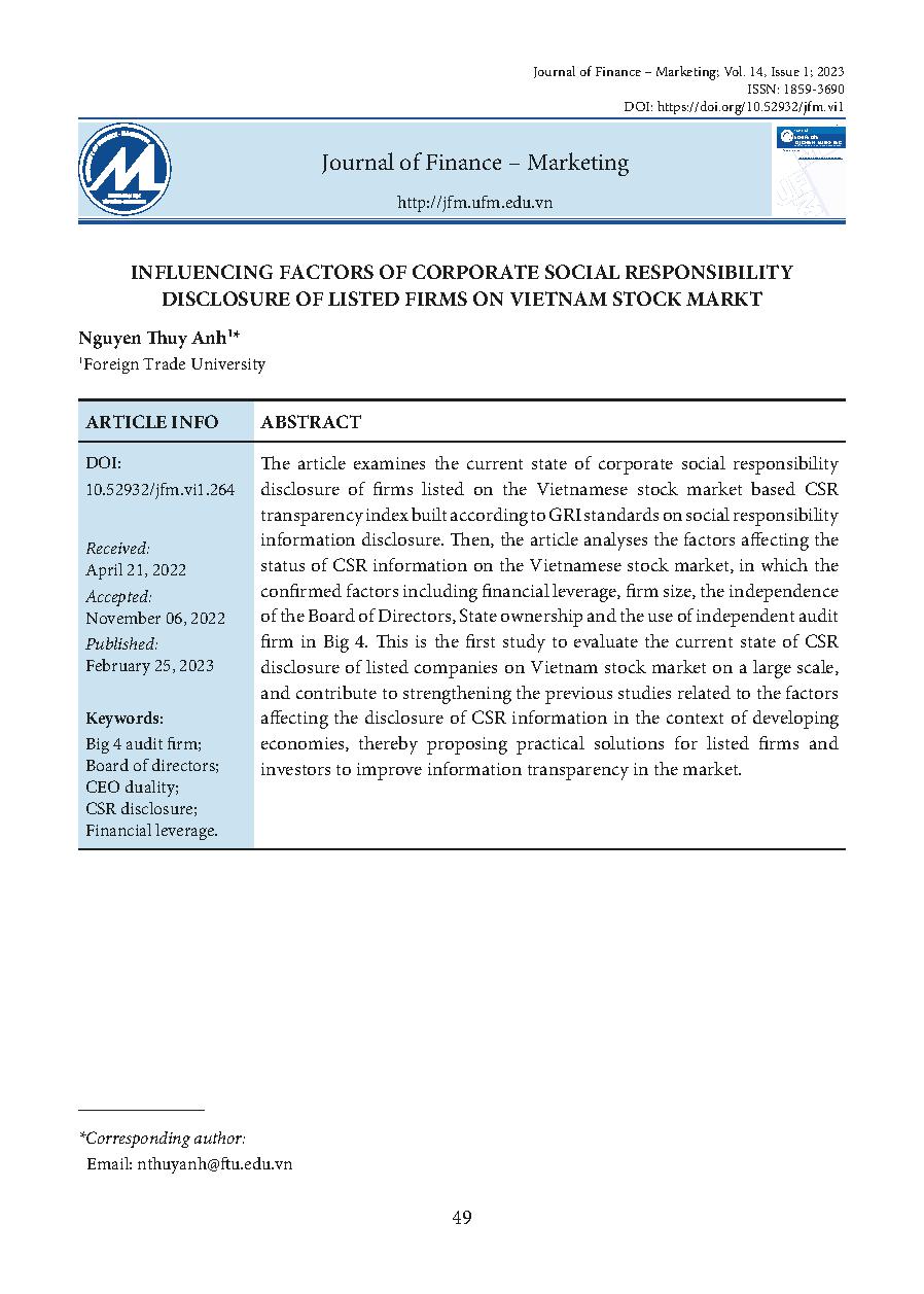 Các yếu tố tác động đến công bố thông tin trách nhiệm xã hội của doanh nghiệp trên thị trường chứng khoán Việt Nam = Influencing factors of corporate social responsibility disclosure of listed firms on Vietnam stock market