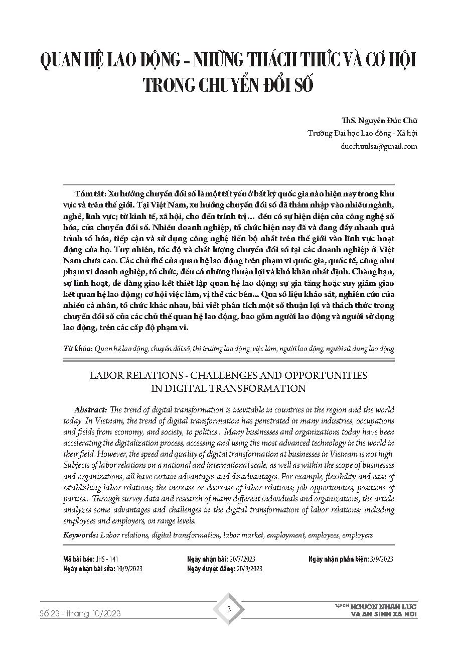 Quan hệ lao động - Những thách thức và cơ hội trong chuyển đổi số = Labor relations - Challenges and Opportunities in digital transformation