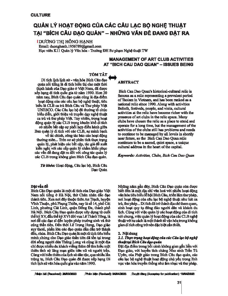 Quản lý hoạt động của các câu lạc bộ nghệ thuật tại "Bích Câu đạo quán" - những vấn đề đang đặt ra