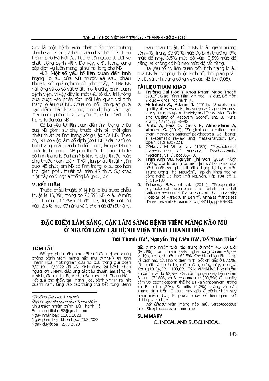 Đặc điểm lâm sàng, cận lâm sàng bệnh viêm màng não mủ ở người lớn tại Bệnh viện tỉnh Thanh Hóa = Clinical and subclinical characteristics of meningitis in adults at Thanh Hoa province hospital