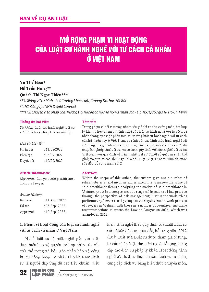 Mở rộng phạm vi hoạt động của luật sư hành nghề với tư cách cá nhân ở Việt Nam = The Performance Scope of the Solo Practitioner in Vietnam