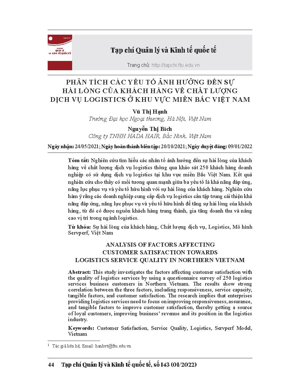 Phân tích các yếu tố ảnh hưởng đến sự hài lòng của khách hàng về chất lượng dịch vụ logistics ở khu vực miền Bắc Việt Nam = Analysis of factors affecting customer satisfaction towards lоgistics service quality in northern Vietnam