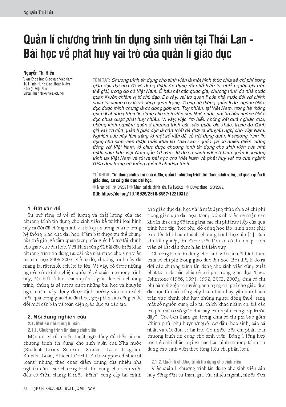 Quản lí chương trình tín dụng sinh viên tại Thái Lan - Bài học về phát huy vai trò của quản lí giáo dục = The management of student loan program in thailand - lessons on enhancing the role of educational management