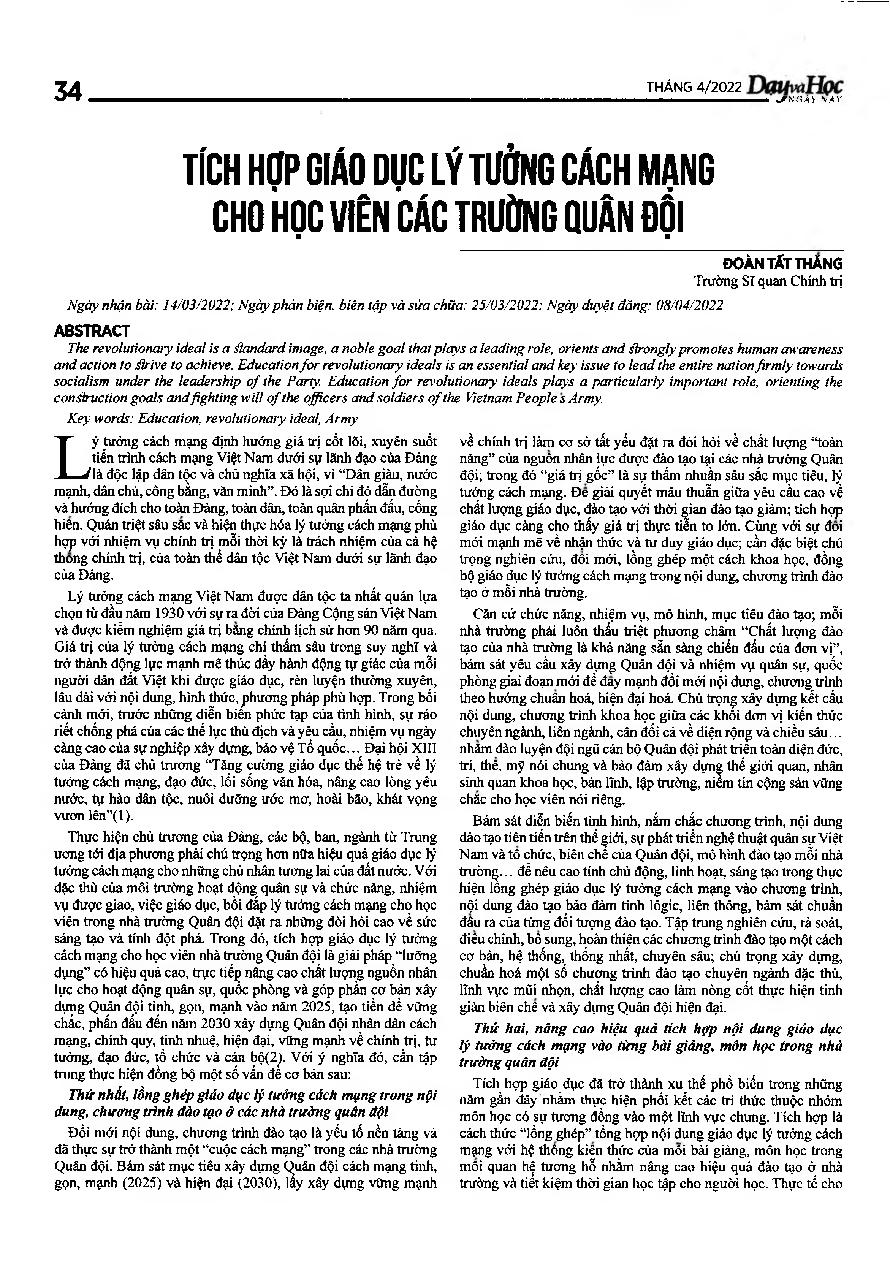 Tích hợp giáo dục lý tưởng cách mạng cho học viên các trường quân đội = Integrating education revolutionary ideas for students of military schools