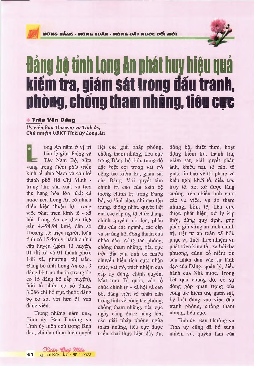 Đảng bộ tỉnh Long An phát huy hiệu quả kiểm tra, giám sát trong đấu tranh, phòng, chống tham nhũng, tiêu cực.