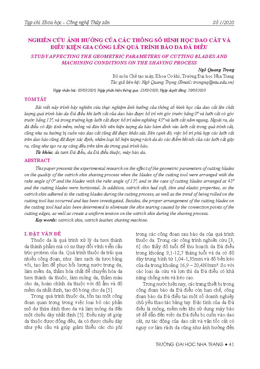 Nghiên cứu ảnh hưởng của các thông số hình học dao cắt và điều kiện gia công lên quá trình bào da đà điểu = Study affecting the geometric parameters of cutting blades and machining conditions on the shaving process