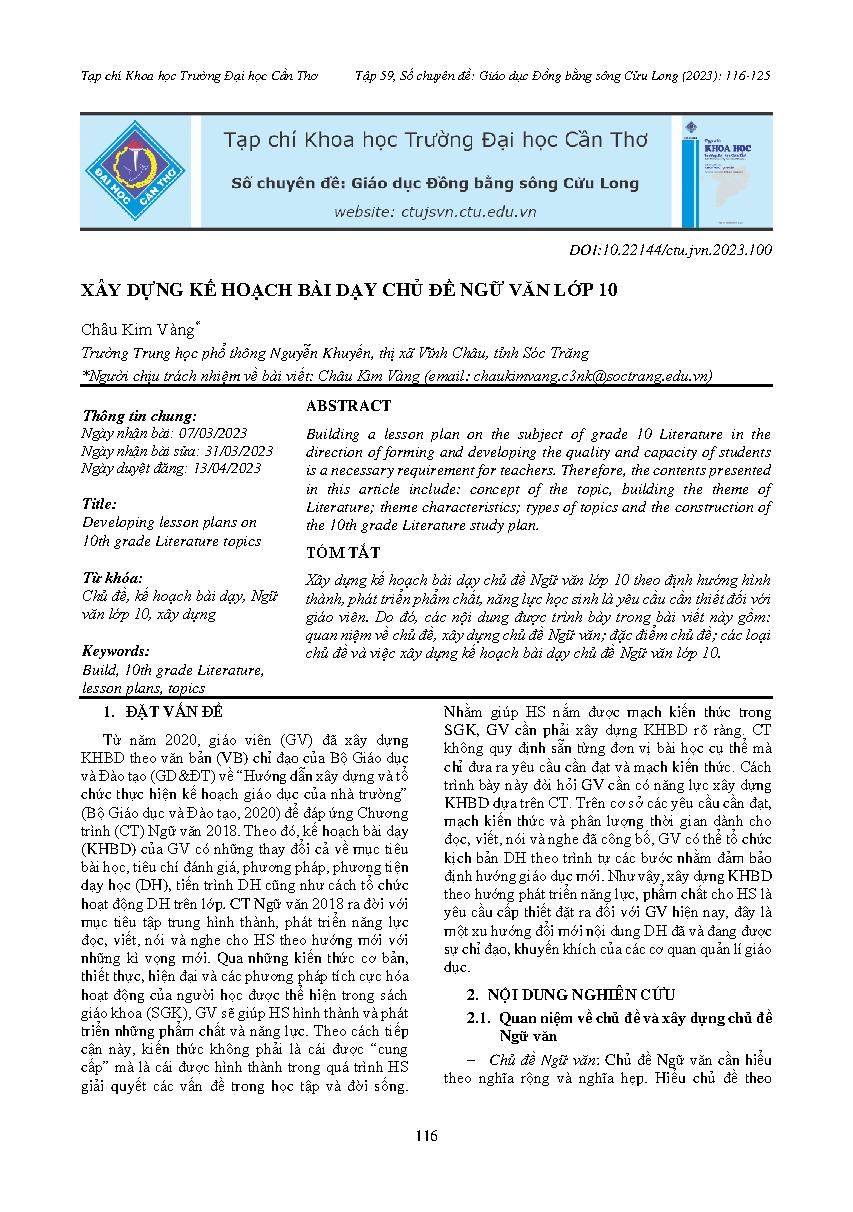 Xây dựng kế hoạch bài dạy chủ đề Ngữ văn lớp 10 = Developing lesson plans on 10th grade Literature topics