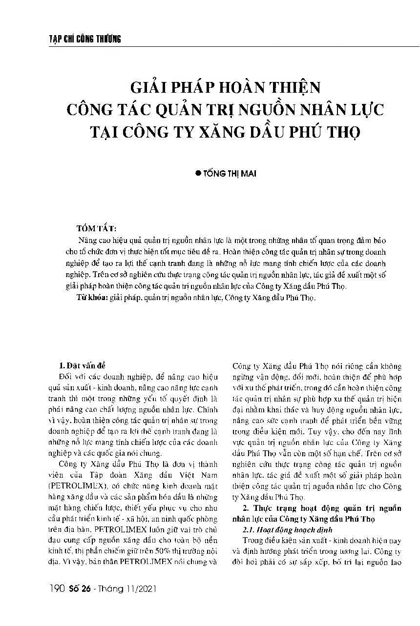Giải pháp hoàn thiện công tác quản trị nguồn nhân lực tại công ty xăng dầu Phú Thọ = Solutions to improve the human resource management of Phu Tho Petroleum Company