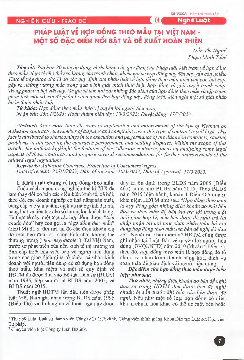Pháp luật về hợp đồng theo mẫu tại Việt Nam - một số đặc điểm nổi bật và đề xuất hoàn thiện = Law on model contracts in Vietnam - some outstanding features and suggestions for improvement