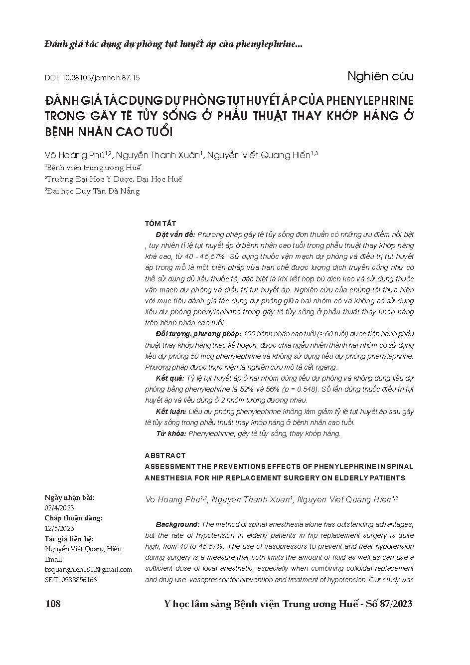 Đánh giá tác dụng dự phòng tụt huyết áp của phenylephrine trong gây tê tủy sống ở phẫu thuật thay khớp háng ở bệnh nhân cao tuổi = Assessment the preventions effects of phenylephrine in spinal anesthesia for hip replacement surgery on elderly patients