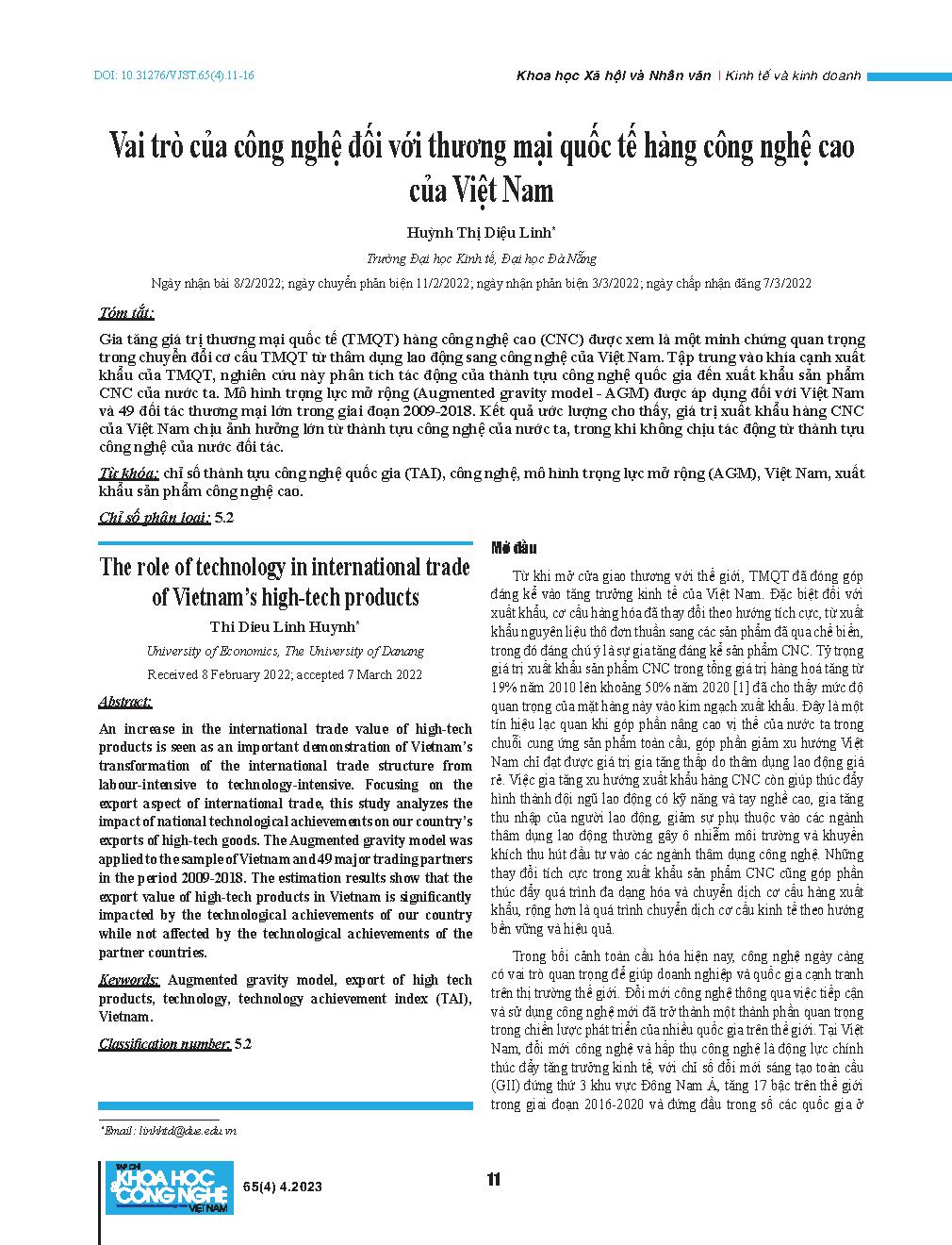 Vai trò của công nghệ đối với thương mại quốc tế hàng công nghệ cao của Việt Nam = The role of technology in international trade of Vietnam's high-tech products