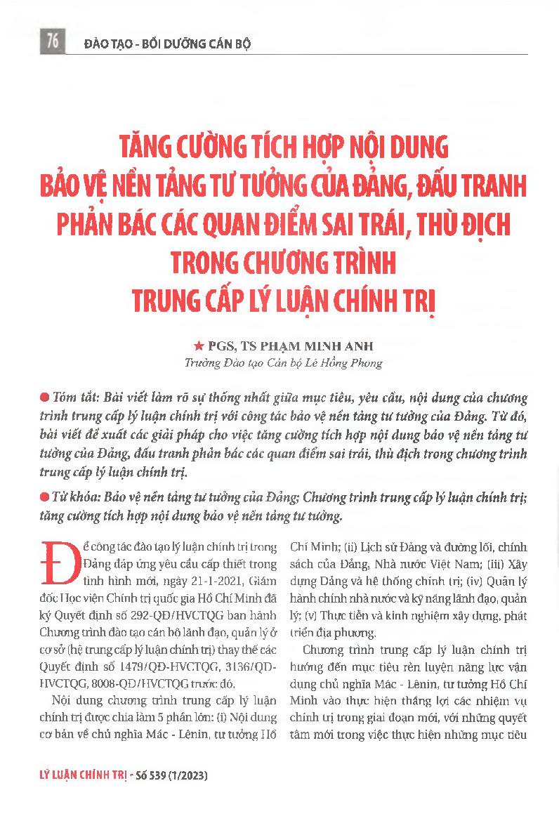 Tăng cường tích hợp nội dung bảo vệ nền tảng tư tưởng của Đảng, đấu tranh phản bác các quan điểm sai trái, thù địch trong chương trình trung cấp lý luận chính trị = Increasing content integration of protecting the ideological foundation of the party, and