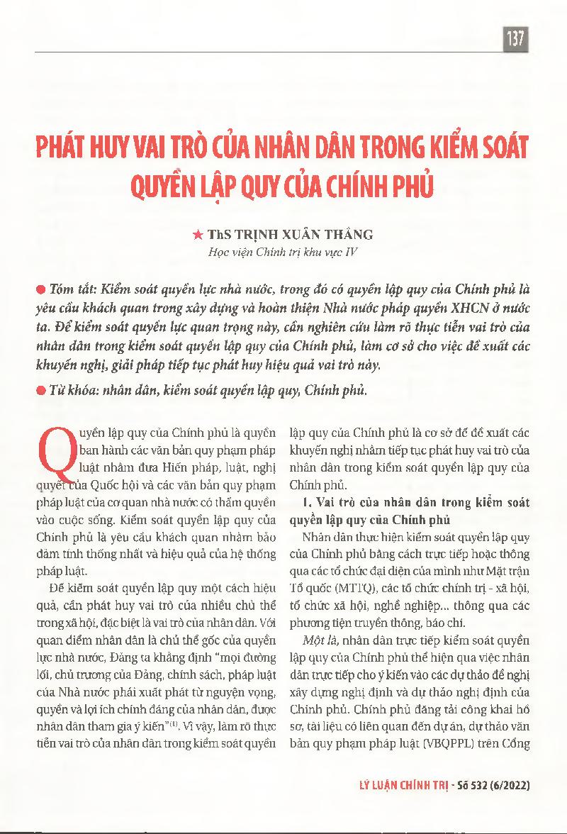 Phát huy vai trò của nhân dân trong kiểm soát quyền lập quy của chính phủ = Promoting the role of the people in controlling the government&; 39;s regulation-making power