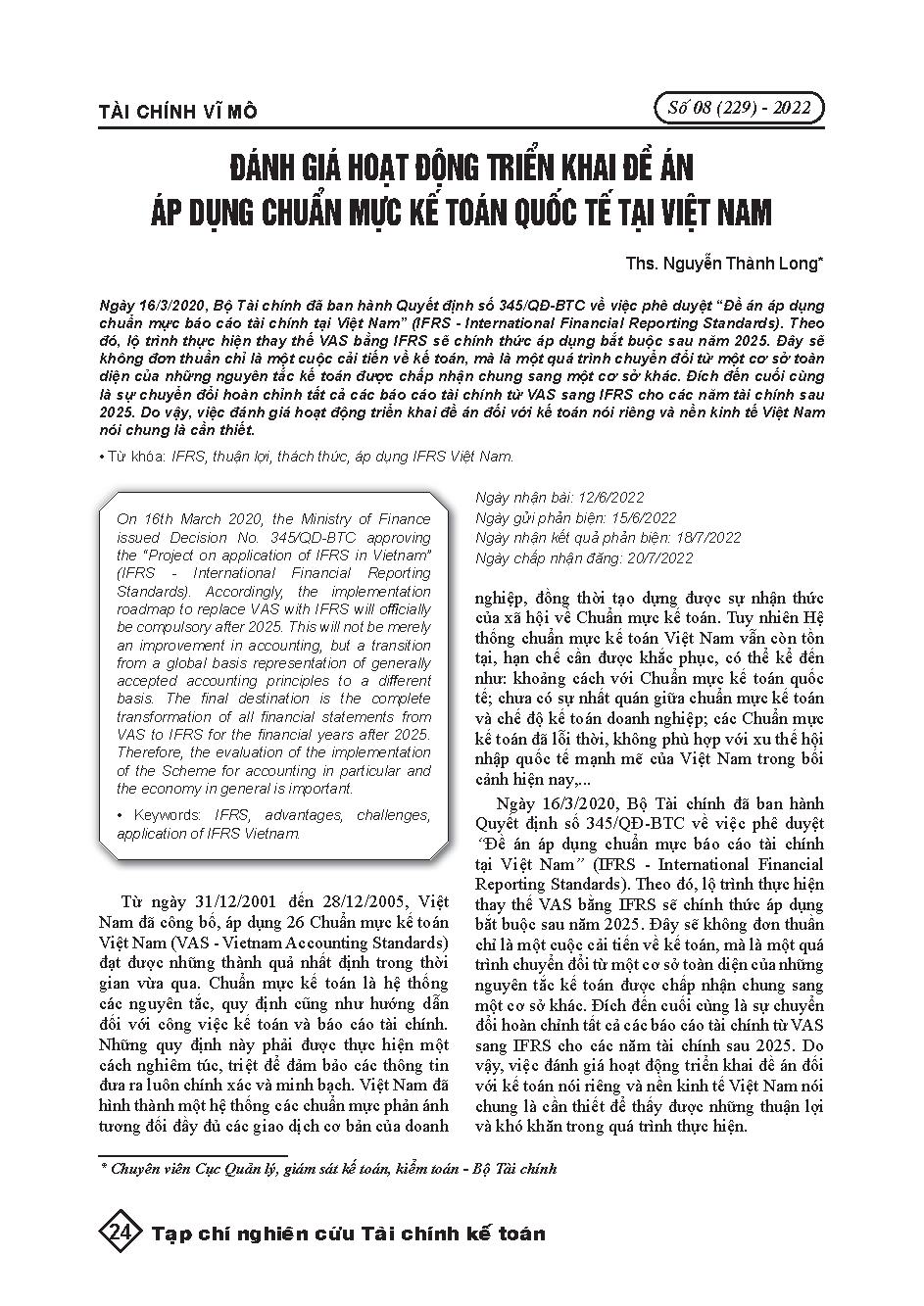 Đánh giá hoạt động triển khai đề án áp dụng chuẩn mực kế toán quốc tế tại Việt Nam = The evaluate of applying IFRS in Vietnam
