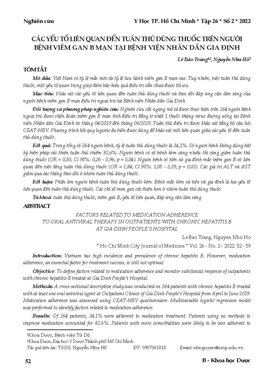 Các yếu tố liên quan đến tuân thủ dùng thuốc trên người bệnh viêm gan B mạn tại Bệnh viện Nhân dân Gia Định = Factors related to medication adherence to oral antiviral therapy in outpatients with chronic hepatitis B at Gia Dinh people’s hospital