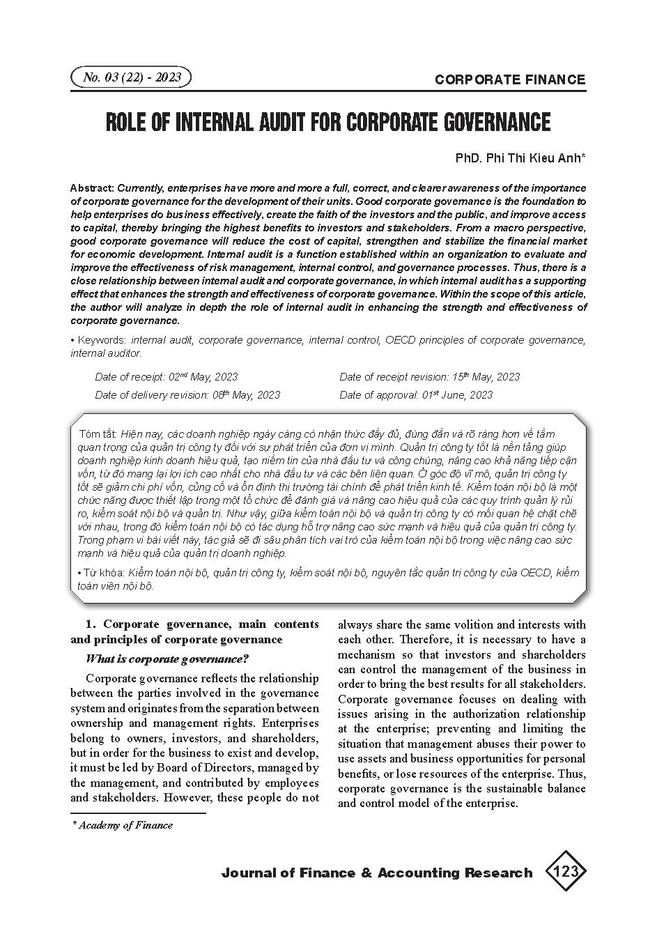 Vai trò của kiểm toán nội bộ đối với quản trị công ty = Role of internal audit for corporate governance