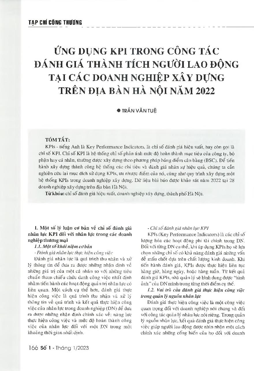 Ứng dụng KPI trong công tác đánh giá thành tích người lao động tại các doanh nghiệp xây dựng trên địa bàn Hà Nội năm 2022 = The application of KPIs in measuring the performance of employees at construction enterprises in Hanoi