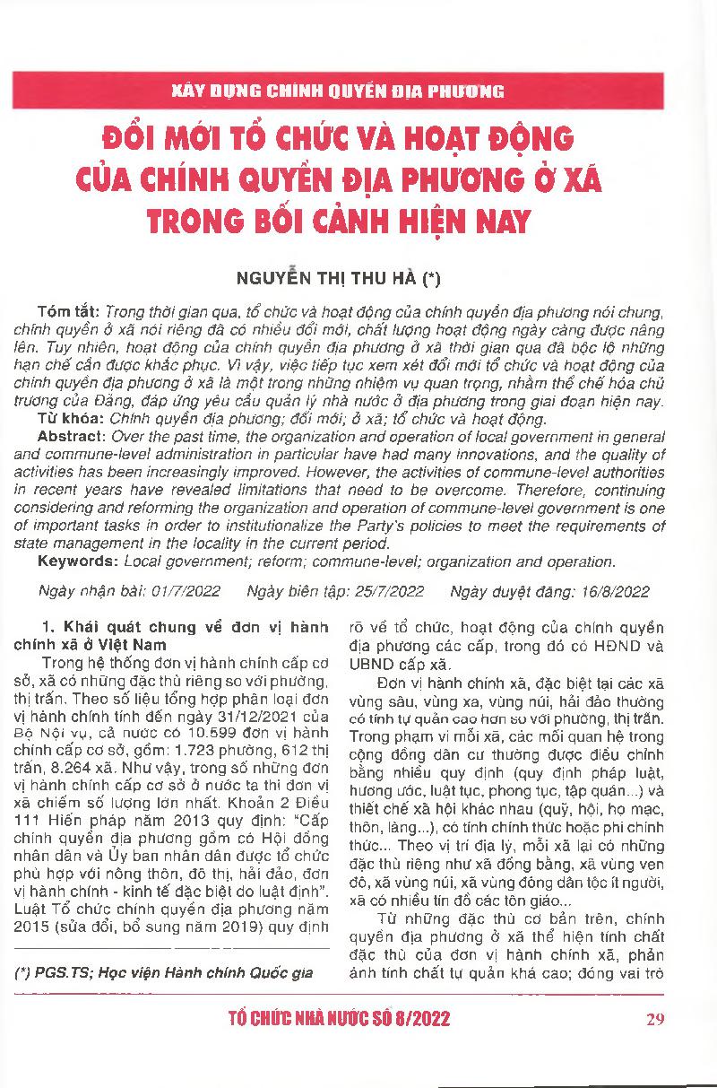Đổi mới tổ chức và hoạt động của chính quyền địa phương ở xã trong bối cảnh hiện nay = Reforming the organization and operation of commune-level government under the current context