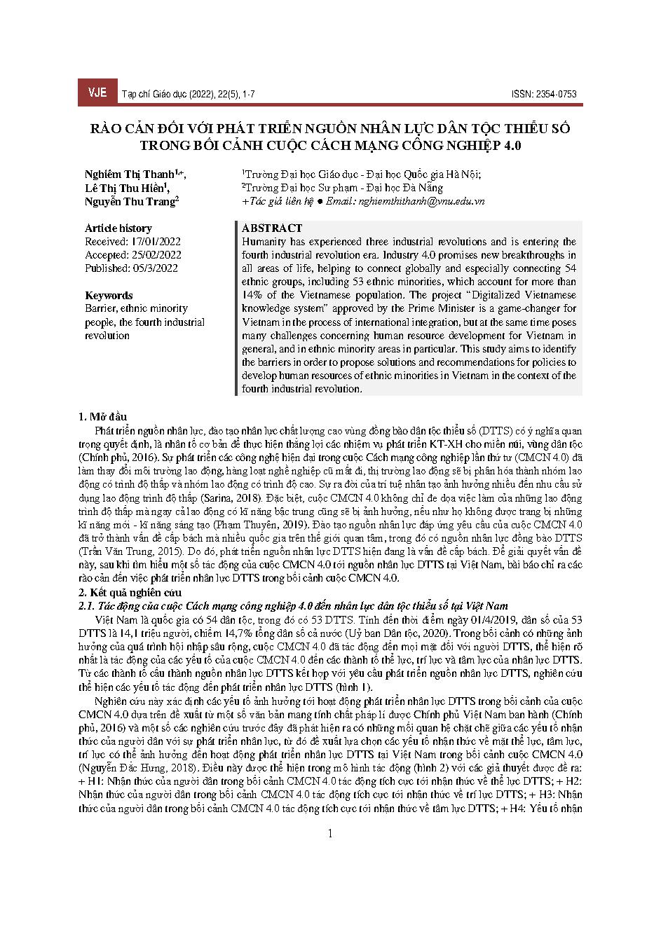 Rào cản đối với phát triển nguồn nhân lực dân tộc thiểu số trong bối cảnh cuộc cách mạng công nghiệp 4.0 = Barriers to the development of human resources for ethnic minorities in the precursor of the industrial revolution 4.0