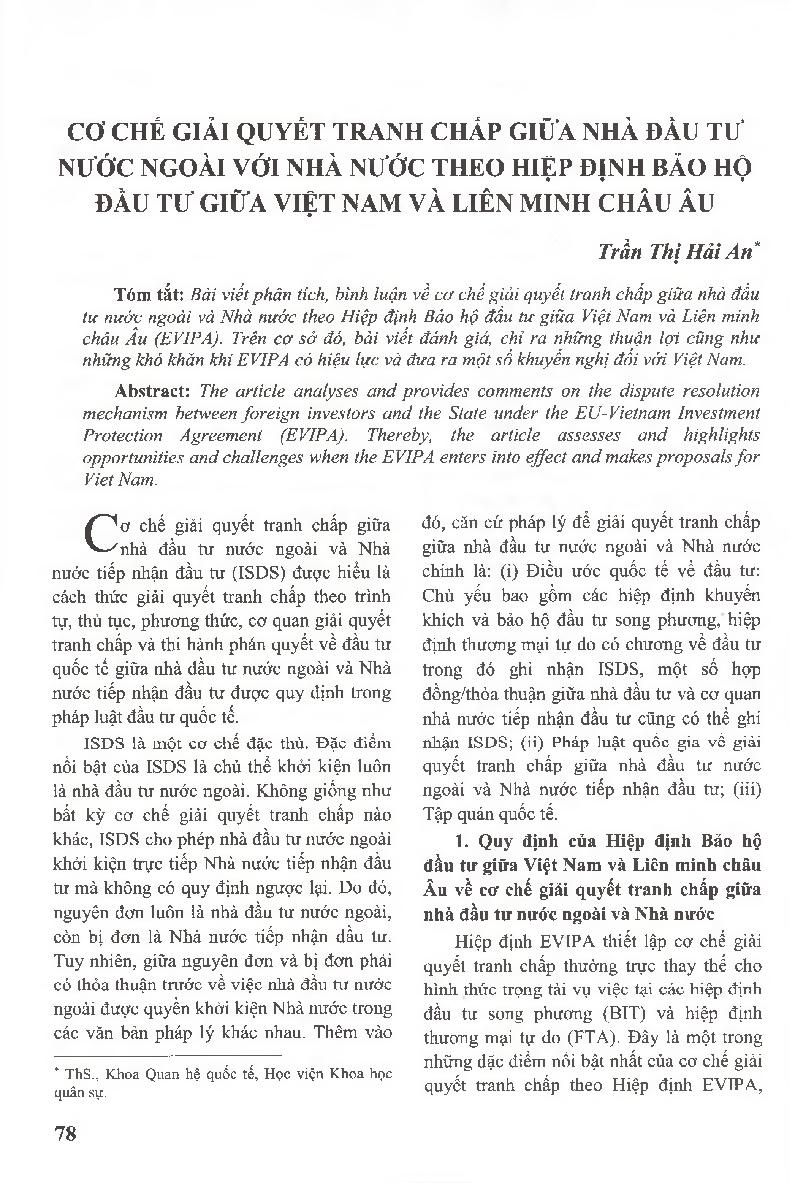 Cơ chế giải quyết tranh chấp giữa nhà đầu tư nước ngoài với Nhà nước theo Hiệp định Bảo hộ đầu tư giữa Việt Nam và Liên minh châu Âu = Dispute Resolution Mechanism between Foreign Investors and the State under the European Union - Viet Nam Investment Prot