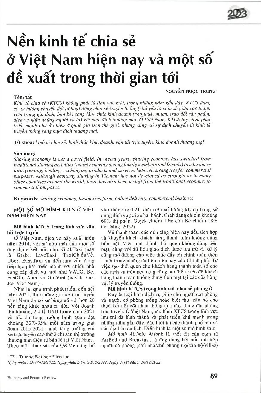 Nền kinh tế chia sẻ ở Việt Nam hiện nay và một số đề xuất trong thời gian tới = Sharing economy in Vietnam and some proposals in the coming time