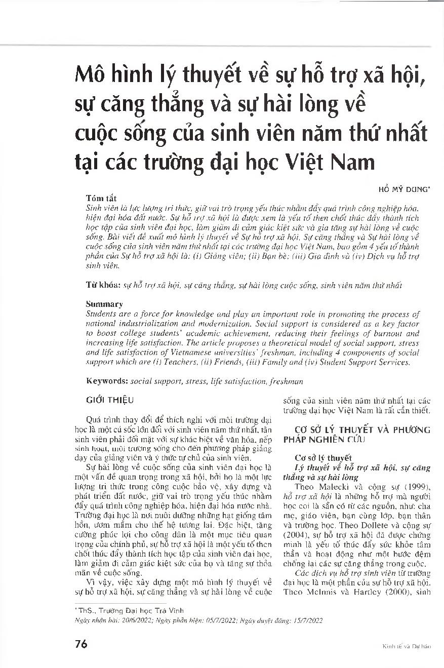 Mô hình lý thuyết về sự hỗ trợ xã hội, sự căng thẳng và sự hài lòng về cuộc sống của sinh viên năm thứ nhất tại các trường đại học Việt Nam = Theoretical model of social support, stress and life satisfaction of Vietnamese universities’ freshman