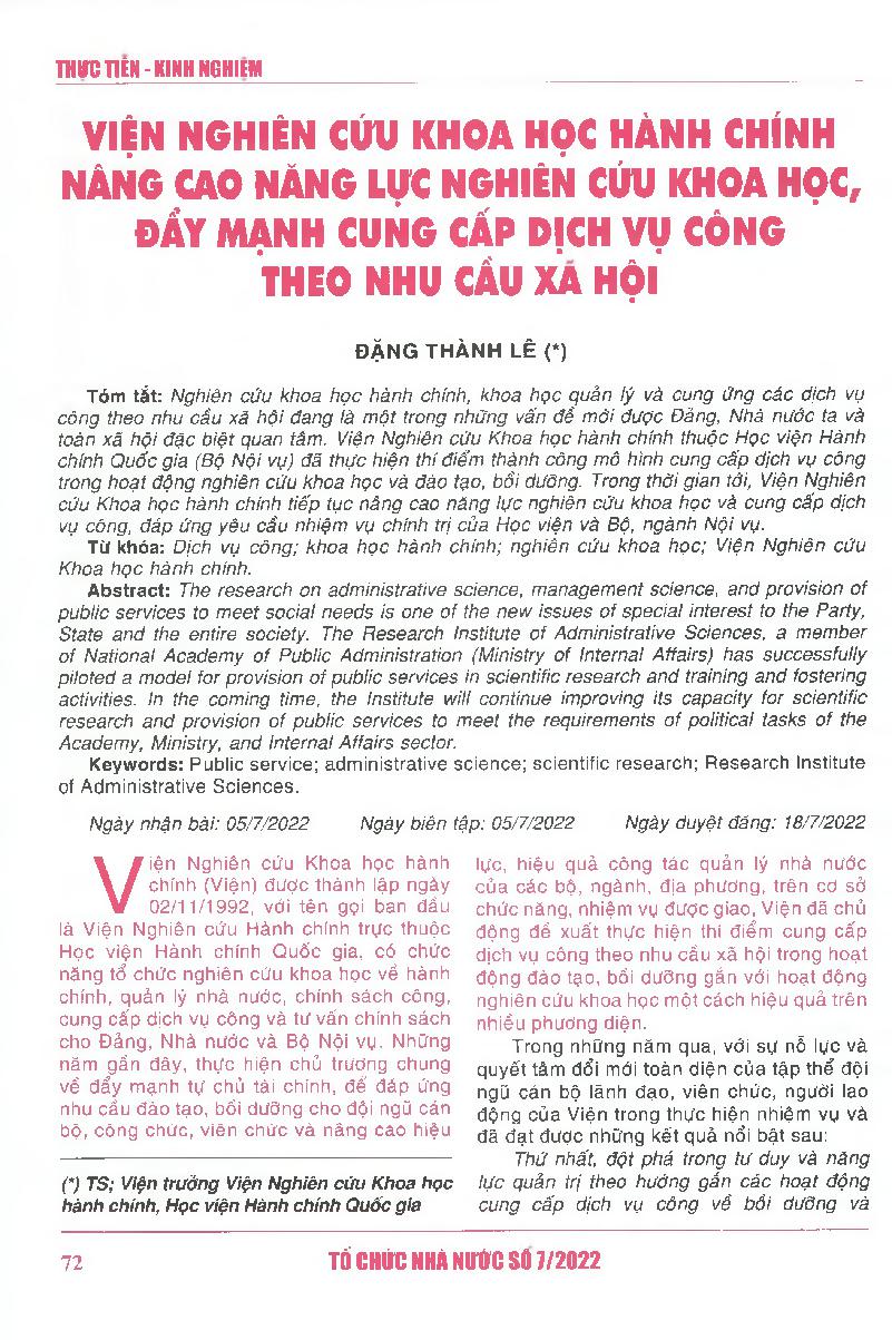 Viện nghiên cứu khoa học hành chính nâng cao năng lực nghiên cứu khoa học, đẩy mạnh cung cấp dịch vụ công theo nhu cầu xã hội = The Research Institute of Administrative Sciences improves scientific research capacity and promotes the provision of public se