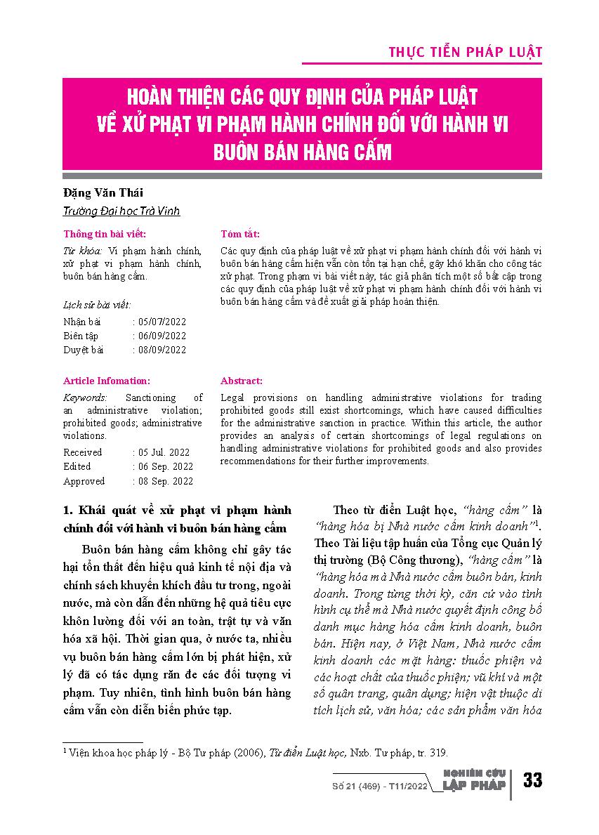 Hoàn thiện các quy định của pháp luật về xử phạt vi phạm hành chính đối với hành vi buôn bán hàng cấm = Improvements of the Legal Regulations on Sanctioning Administrative Violations for the Act of Trading in Prohibited Goods