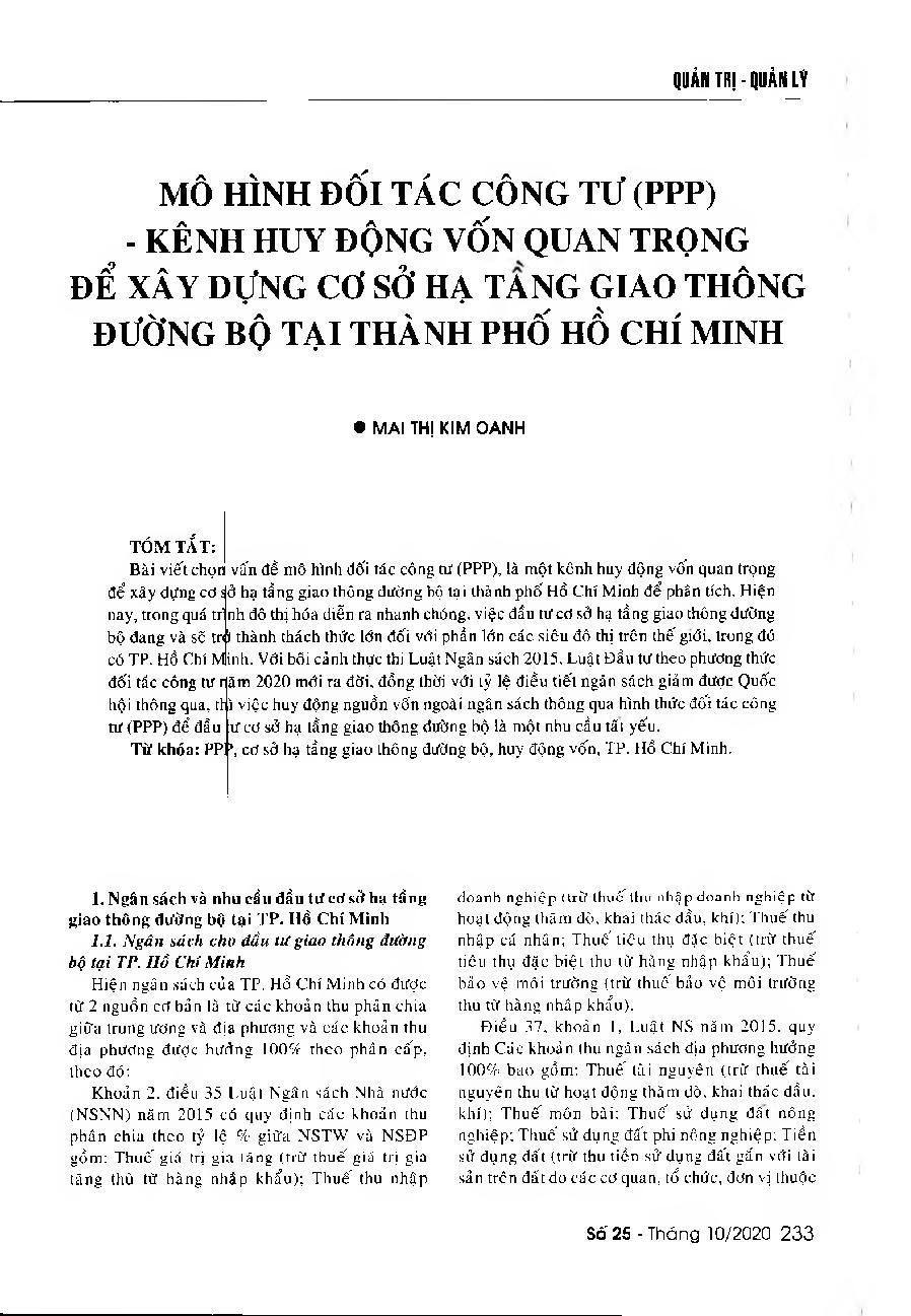 Mô hình đối tác công tư (PPP) - Kênh huy động vốn quan trọng đế xây dựng cơ sở hạ tầng giao thông đường bộ tại thành phố Hồ Chí Minh = The pubtic-private partnership (PPP) model - The important investment mobilization for the development of Ho Chi Minh City's road-traffic infrastructure