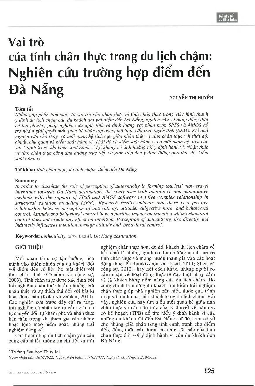 Vai trò của tính chân thực trong du lịch chậm: Nghiên cứu trường hợp điểm đến Đà Nẵng = The role of authenticity in slow travel: Case study of Da Nang destination
