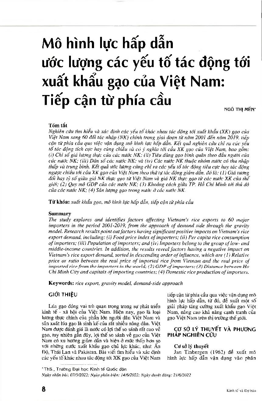 Mô hình lực hấp dẫn ước lượng các yếu tố tác động tới xuất khẩu gạo của Việt Nam: Tiếp cận từ phía cầu = Gravity model to estimate factors affecting Vietnam’s rice exports: From the approach of demand side