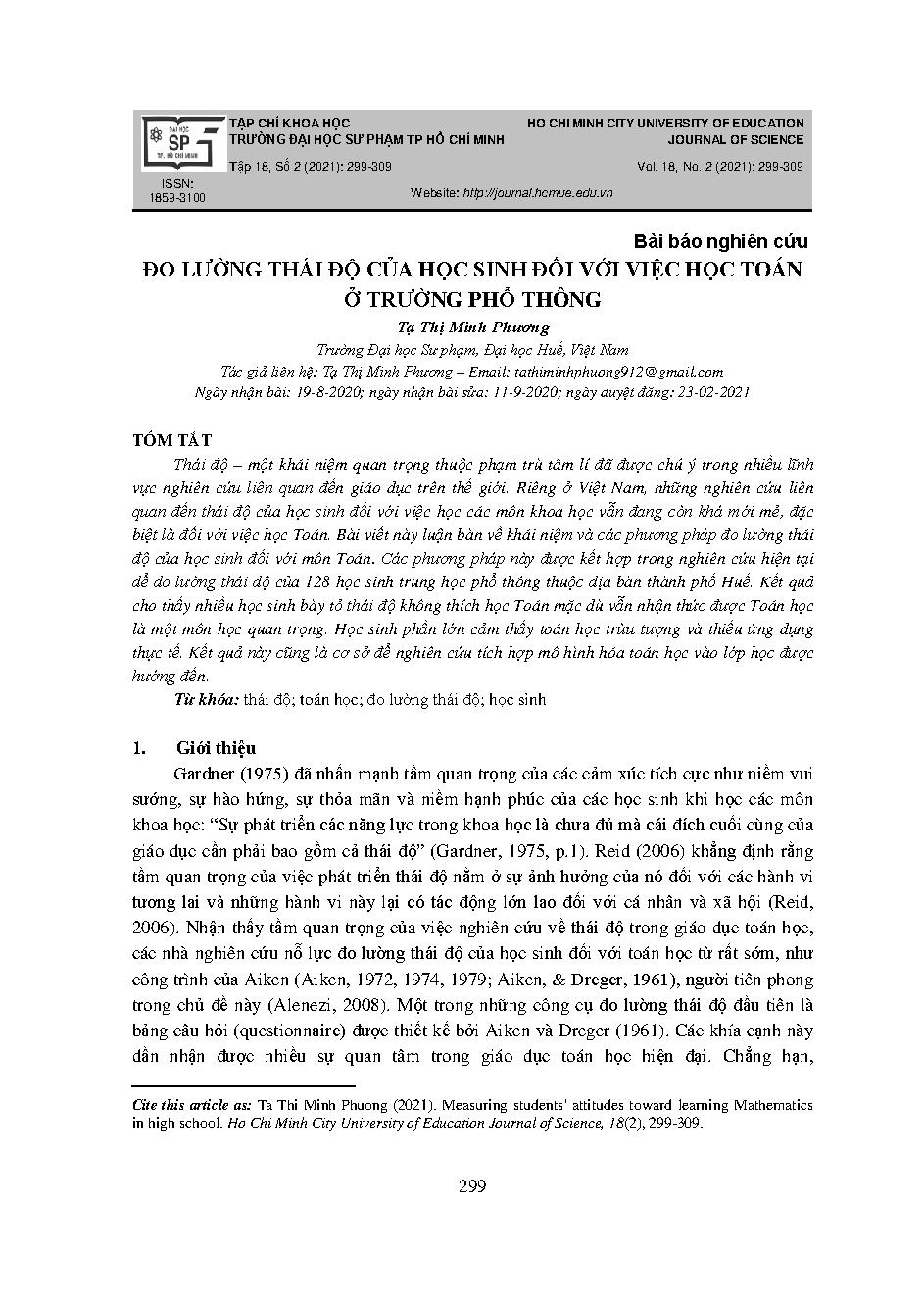 Đo lường thái độ của học sinh đối với việc học toán ở trường phổ thông = Measuring students' attitudes toward learning mathematics in high school