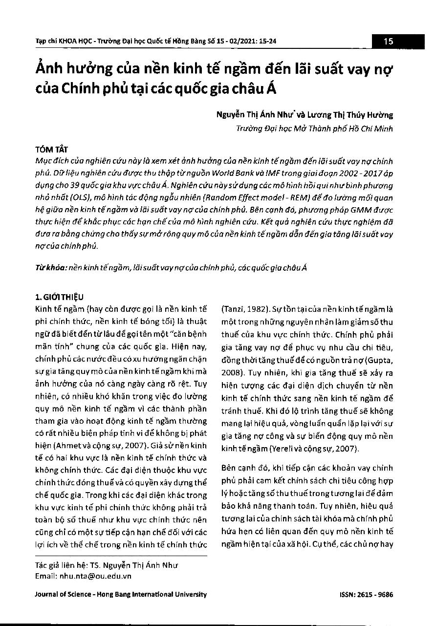 Ảnh hưởng của nền kinh tế ngầm đến lãi suất vay nợ của Chính phủ tại các quốc gia châu Á = The Impact of shadow economy on the interest rate on Government debt: Evidence from Asian countries